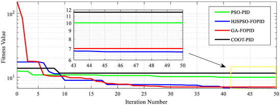where is the current swarm’s best position. The optimal values obtained using the HJSPSO for FOPID, GA for FOPID, the COOT for linear PID, and the PSO for linear PID are given in Table 3. The final errors for each algorithm after 50 iterations are shown in Figure 4.