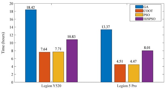 When comparing the computational complexity of the HJSPSO algorithm with other optimization algorithms, such as PSO, COOT, and GA, it is essential to ensure that the comparison is valid by executing the algorithms on the same hardware specifications. The comparative analysis involved two distinct computing systems. The initial system, namely, the Legion Y520, was equipped with a seventh-generation Intel Core i7-7700HQ processor, a GTX 1060 graphics card with 6 GB GDDR5 VRAM, 16 GB of DDR4 RAM, and a 256 GB SSD. Conversely, the second system, namely, the Legion 5 Pro, featured an eight-core Ryzen 7 5800H processor, an RTX 3070 graphics card with 8 GB GDDR6 VRAM, 16 GB of DDR4 RAM operating at a frequency of 3200 MHz, and a 1 TB SSD. The execution times of different algorithms could provide insights into their relative efficiency and effectiveness in solving optimization problems. Figure 5 can be used to visually represent the comparison of execution times of different algorithms on the two computing systems, allowing readers to quickly understand the differences in their computational complexity.