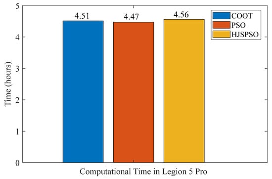 Also, we conducted a comparison of the COOT, PSO, and HJSPSO algorithms on the Legion 5 Pro by optimizing only the 12 gains of a conventional PID controller to assess the complexity of the hybrid algorithm in comparison to PSO and COOT. The results are presented in Figure 6. The computational times of the three algorithms are very similar. However, due to the higher complexity of the HJSPSO algorithm, it required more computational time than the PSO and COOT algorithms.