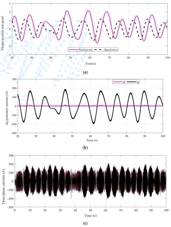 The Simulink results involve the current position and velocity of the wave energy conversion system with respect to time, the three-phase currents, the stator dq currents, the generated power, the DC link voltage, the grid voltage, the responses of real and reactive powers at the connection point with the grid (point of common coupling (PCC)), and the dq currents at the grid side. Starting with connecting the system and supplying electrical power to the power grid for 100 s, the simulation results during the steady state of normal operation are provided in Figure 7.