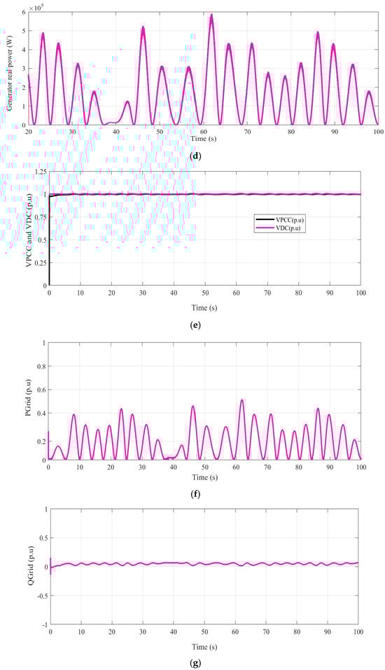 (a) and of the wave energy conversion device, (b) the quadrature and direct axis currents of the stator, (c) the three-phase generated currents (“” (black), “” (red), and “” (blue)), (d) the real power produced by the linear generator, (e) and , (f) the injected real power (), and (g) the injected reactive power ().