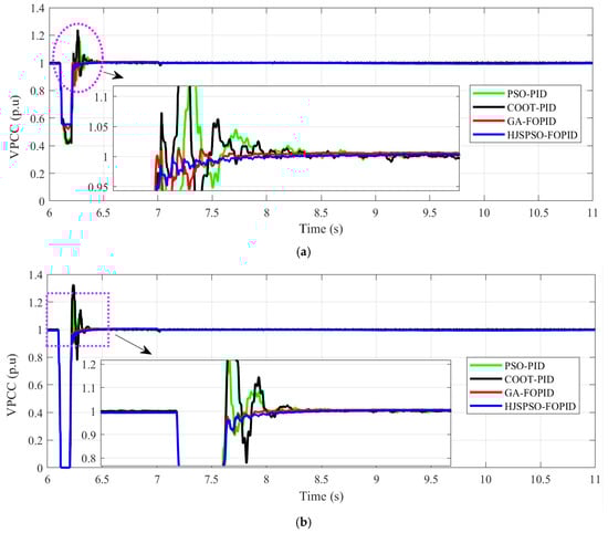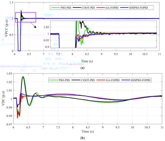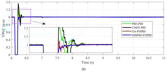 Similar to the symmetrical fault results, the HJSPSO-FOPID controllers outperformed the GA-FOPID, PSO-PID, and COOT-PID controllers and prevented from overshooting above 1 p.u. In summary, without any doubt, the HJSPSO-FOPID had a much better capability in achieving the control goals compared with the GA-FOPID, PSO-PID, and COOT-PID controllers. This made it a more favorable and reliable choice when controlling the grid-connected AWS.