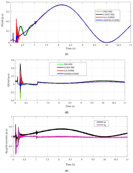The results show that the HJSPSO-FOPID and the GA-FOPID controllers showed ideal performance in preventing from overshooting above 1 p.u compared with the conventional PID controllers. Furthermore, had the lowest overshooting and dip in the case of HJSPSO. The response had the lowest fluctuations and a very quick return to the steady state value of the power in the case of HJSPSO-FOPID. The dq currents at the grid side were also maintained under 1 p.u during the fault conditions. Finally, had the best combination of a reasonable balance between overshooting and undershooting compared with the others. For more validation of the FOPID performance, the unsymmetrical fault responses are shown in Figure 9.