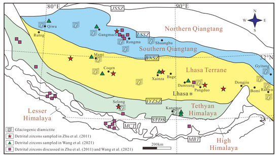 - Leier, A.L.; Kapp, P.; Gehrels, G.E.; DeCelles, P.G. Detrital Zircon Geochronology of Carboniferous–Cretaceous Strata in the Lhasa Terrane, Southern Tibet. Basin Res. 2007, 19, 361–378. [Google Scholar] [CrossRef]