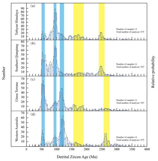 Detrital zircon U-Pb age spectra of the main terranes of the Tibetan Plateau reported in [59]. The blue transparent bands prominently highlight the characteristic age intervals that serve as the main focus in the original data, while the yellow transparent band conspicuously indicates the supplementary age range discussed in this study.