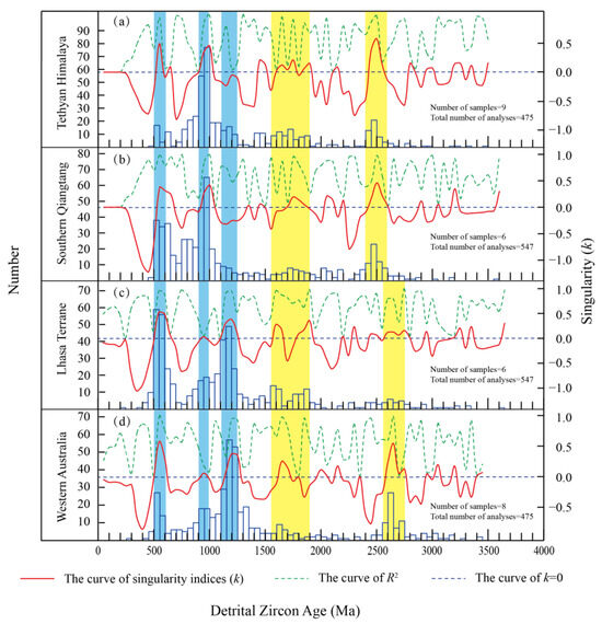 The application of local singularity analysis to the first dataset enhances weak provenance information on the age spectrum by quantitatively characterizing temporal variations in detrital zircon age populations. These preliminary provenance clues, which may be overlooked due to their inconspicuous expression, deserve attention. Furthermore, supported by the age spectra of the second dataset, the provenance affinity between Qiangtang–Tethyan Himalaya (ca. 2500 Ma) and Lhasa–Western Australia (ca. 1600 Ma) can be clarified, echoing established provenance connections identified in the singularity spectrum (Figure 6 and Figure 7). To further explore practical applications of local singularity analysis in more detail, we analyze the second dataset to determine if any potential provenance clues have been overlooked in the age spectrum. From the singularity spectra of the second dataset (Figure 7), a similar grouping scheme can be established based on dominant singularity peaks, as mentioned above. For the Southern Qiangtang–Tethyan Himalaya group, peaks at approximately 820, 950, and 2480 Ma are retained with high R2 values, without any new discoveries at other ages. The Lhasa–Australia group exhibits distinctive peaks at around 1170 and 1760 Ma. In the Lhasa spectrum, there is an enhancement of peaks in the range of 2650–2760 Ma; however, no corresponding peaks are observed in the Australia spectrum. These findings further demonstrate that local singularity analysis is an effective method for enhancing weak provenance information. By ensuring consistent provenance clues with those obtained from age spectra analysis, this method can provide additional clues to establish provenance connections even with a limited number of analyses, and offer preliminary guidance for future research endeavors. Moreover, it also emphasizes that both quantity of analyses and sampling coverage are crucial factors since well-preserved provenance information and a sufficient number of analyses serve as essential foundations for enhancing and recognizing weak provenance information.