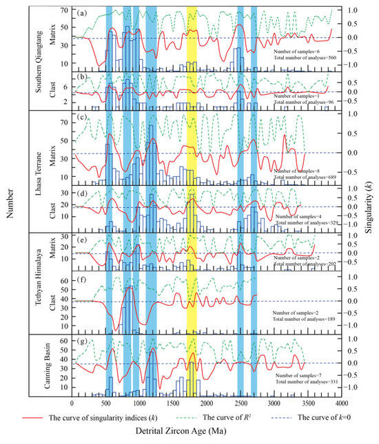 The most significant advantage reflected in the current case study is to identify weak provenance information assisting in understanding the affinity of Southern Qiangtang–Tethyan Himalaya and Lhasa–Western Australia ca. 2500 and 1600 Ma, respectively (Figure 6). The identification was not clarified based on the first dataset due to weak information and limited quantity issues. Changing sampling media of detrital zircons (matrix and clast of PCGDS), more delicate analyses can then establish the affinity between these terranes ca. 1600 and 2500 Ma. Therefore, the current case study well demonstrates a new graphical method for age correlation for provenance analysis which can reveal more comprehensive and detailed provenance clues. Moreover, it facilitates making a strategy if more sampling and analyses are necessary to further enhance understanding of provenance in future work. Meanwhile, methods to quantify differences and similarities among age spectra can be considered for the correlation of singularity index spectra in the future. It should be expectable that singularity spectrum-based provenance analysis is not only effective in quantifying temporal variation in detrital zircon age population but also in improving missing and omission issues of weak but significant information.