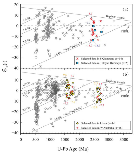 Plots of εHf(t) and detrital age data from Southern Qiangtang and the Tethyan Himalaya (a), as well as Lhasa and Western Australia (b), as reported in [58]. The highlighted colors indicate the periods discussed in the current study.