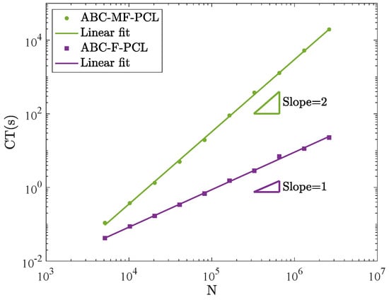 - The computational costs, obtained by measuring the CPU time (in seconds) executed by the conventional PCM and the fast PCM versus the total number of steps N on the log-log scale in Example 2, are depicted in Figure 1. The figure shows that the CPU consumption rate of the fast PCM is , whereas that of the conventional PCM is .