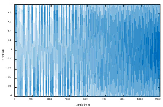 Figure 2 displays the waveform of the chirp signal. It encompasses a total of 16,000 sample points, the sliding window of 1 s is chosen, with a 90% overlap of this window, which allows us to obtain 150 samples. And the complexity curves of six metrics for the chirp signal are presented in Figure 3, where we only present the situations of and .