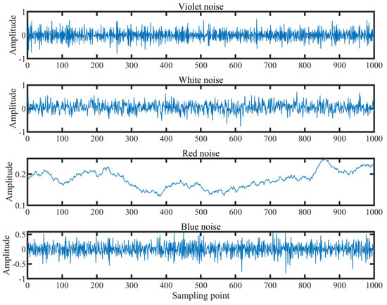 For this classification experiment, four distinct noise signals were selected to illustrate the superior performance of the proposed VSMKFD, consisting of violet noise, white noise, red noise, and blue noise. Then we take 100 non-overlapping samples, each with a total of 1000 sampling points. Figure 4 shows the waveforms of four noise signals under one sample to display the characteristics of these noise signals.