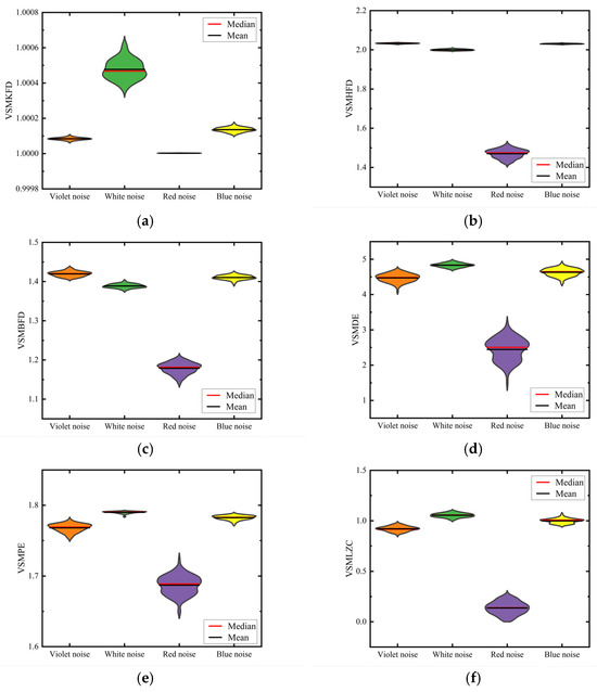 From Figure 6, the situation with is similar to that with ; all six nonlinear dynamic metrics can distinctly differentiate red noise from the other three noise types; in the case of the VSMKFD, violet noise and blue noise overlap only slightly. Conversely, for the other five metrics, there is a noticeable overlap among the violet, white, and blue noise, with the most significant overlap continuing to be in the VSMDE. In summary, the VSMKFD demonstrates superior capability in differentiating noisy signals, further attesting to its efficacy.
