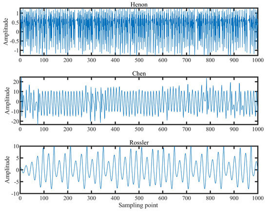 In addition to the noise signal classification experiment, we conducted further tests using three distinct chaotic signals to validate the feature extraction capabilities of the proposed VSMKFD. Figure 7 shows the waveforms of the Henon [33], Chen [34], and Rossler [35] signals in one sample.