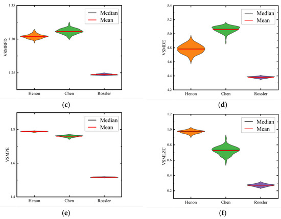Figure 8 and Figure 9 show the feature distribution of six metrics for chaotic signals. As before, we present only the scenarios of and . It can be observed from Figure 8 and Figure 9, that whether or , there is no overlapping distribution area in the VSMKFD, and the means of three chaotic signals also differ greatly, which indicates that the three kinds of chaotic signals can be distinguished; all three chaotic signals produce a large area of overlap in the distribution map of the VSMHFD; neither the VSMBFD nor the VSMDE can fully distinguish between the three chaotic signals; both the VSMPE and the VSMLZC can only distinguish the Rossler signal, while the distributions of Henon and Chen signals have large overlaps. With the above analysis, we can see that the VSMKFD has better classification performance on chaotic signals.
