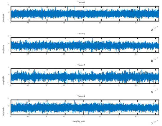 In this section, we select four tanker singles from the DeepShip database [37], including KIRKEHOLMEN, CARIBBEAN SPIRIT, CHERRY GALAXY, and CHAMPION EBONY, named as Tanker-1, Tanker-2, Tanker-3, and Tanker-4. In addition, the sampling frequency is 32,000 Hz, and we also selected 200 samples, each encompassing 2048 sampling points. Figure 12 displays the normalized waveform of four tanker signals.