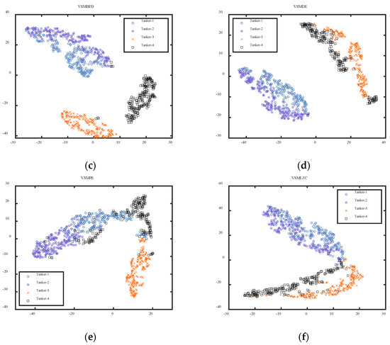 The visualization results of extracted features of four tanker signals: (a) VSMKFD; (b) VSMHFD; (c) VSMBFD; (d) VSMDE; (e) VSMPE; (f) VSMLZC.
