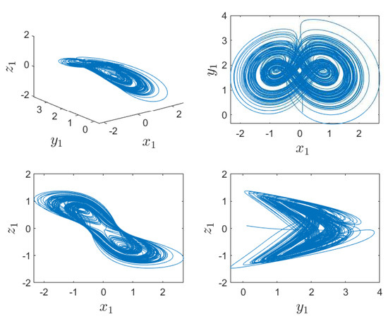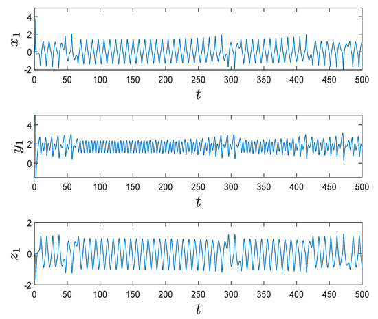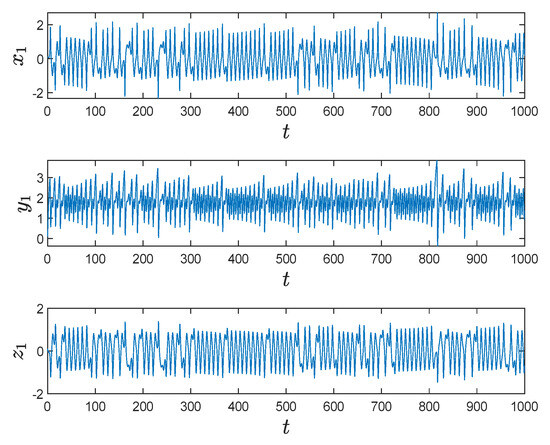 Some specific values are chosen to visualize more intuitively the dynamics of system (2). The states of system (2) are in chaotic motion as shown by the bifurcation diagram when . The corresponding chaotic attractors are shown in Figure 6, and the system state trajectories are shown in Figure 7.