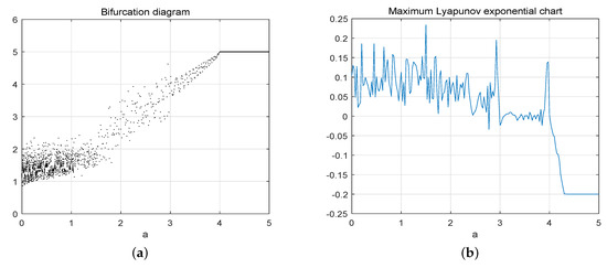 In Figure 2, the bifurcation diagram and maximum Lyapunov exponent plot illustrate the system’s rich dynamical behavior, as a varies within the interval [0, 5]. When , the system exhibits a period-one state, with a period-doubling bifurcation occurring at . For , the system transitions to an unstable cyclic state, while for , the system remains in a fully chaotic state. The maximum Lyapunov exponent, shown in Figure 2b, exceeds zero when , indicating chaotic behavior. It fluctuates around zero for , and becomes negative for , indicating periodic behavior. The bifurcation diagram is consistent with the behavior indicated by the maximum Lyapunov exponent. The phenomenon of the fractional dimension is closely linked to chaos, forming a crucial part of fractal theory. According to the Kaplan–Yorke dimension, a fractional dimension indicates chaotic dynamics, whereas an integer dimension, less than the state space dimension, corresponds to an ordered state.
