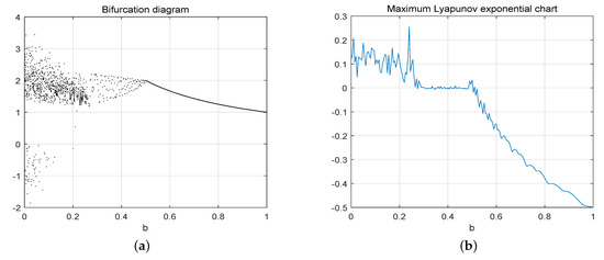 In Figure 3, the bifurcation diagram and maximum Lyapunov exponent plot illustrate the system’s dynamical behavior with b as the control variable, while . As b varies in the interval [0, 1], the system demonstrates rich dynamical behaviors, transitioning from a periodic state to a chaotic state through an inverse multiplicative bifurcation. Specifically, for , the system remains in a periodic state, with a bifurcation occurring at . When b decreases below 0.505, the system enters a fully chaotic state. The maximum Lyapunov exponent, as shown in the plot, is negative when , indicating the system is in a periodic state. As b decreases below 0.505, the maximum Lyapunov exponent becomes positive, signifying chaotic behavior. The results from the maximum Lyapunov exponent plot align with the bifurcation diagram.