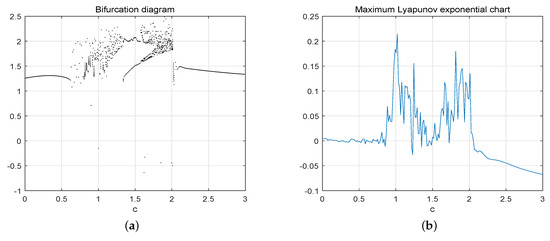 In Figure 4, the bifurcation diagram and maximum Lyapunov exponent plot depict the system’s behavior with c as the control variable. The system exhibits a cyclic state when , with a bifurcation occurring at . For , the system enters a chaotic state, with another bifurcation occurring at . When , the system transitions to a doubled-cycle state, and a bifurcation occurs at . Between , the system remains chaotic, while for , the system returns to a cyclic state. The maximum Lyapunov exponent plot confirms the results shown in the bifurcation diagram.