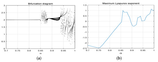 For the purpose of analyzing the effect of the fractional-order , the parameters are chosen as , and the step size is chosen as . Figure 5 illustrates the bifurcation diagram of the system for in the interval (0.7, 1). The system states are cyclic when . The system bifurcates at . The system states are chaotic when . The system states are in a doubled cycle when . The bifurcation occurs again at and remains chaotic thereafter. Correspondingly, the maximum Lyapunov exponent plot yields the same results as the bifurcation plot.