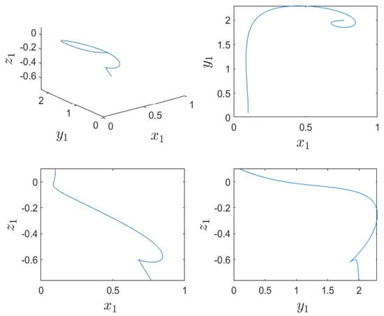 System (2) is out of chaos by the bifurcation diagram when . The phase diagram is shown in Figure 8, and the system state trajectories are shown in Figure 9. These plots are consistent with the results of the bifurcation diagram and the maximum Lyapunov exponent diagram, which implies the complicated interactions among the real interest rate, the investment demand, and the price indicator.