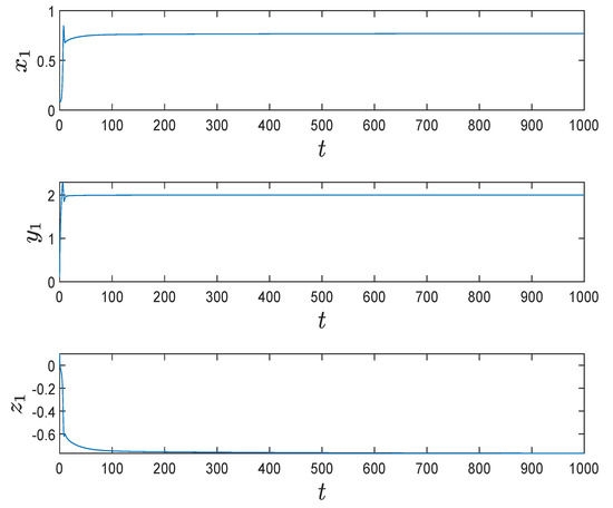 Figure 1 illustrates the state trajectories of the system with initial value . It can be seen from the figure that the equilibrium point of the system is unstable.