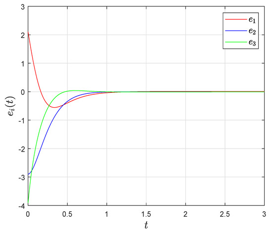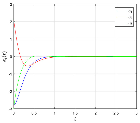 We change the initial value of response system to (0.1, 0.2, 1). Figure 12 shows an image of the error variables of the two systems. Figure 13 shows the trajectories of the synchronization of the corresponding state variables of the two systems, which visually demonstrates the effect of the synchronization of the two systems under the action of the controller.