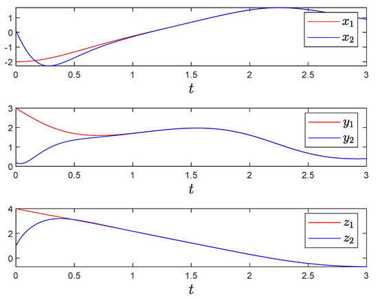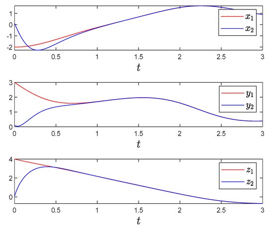 Figure 10 shows an evolution of the errors over time, where each error variable converges to 0 after a certain period of time. Figure 11 illustrates the trend of the trajectories of the two systems as the corresponding variables converge to synchronization. It is more straightforward to show the effect of synchronization of the systems under the action of the controller. It also can be seen that all the error signals converge to 0 in approximately 1.2 s and stabilize around 0 later from Figure 10, which implies the synchronization of the state variables.
