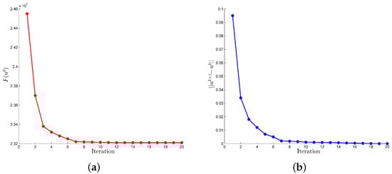 Figure 8 shows the convergence behavior of the iterative support shrinking algorithm. Specifically, Figure 8a shows the history of the energy function value changing with the number of outer iteration number; Figure 8b shows the history of the value changing with the number of outer iteration number. We can clearly observe that as the outer iteration number k increases, decreases and converges, which validates the theoretical result in Lemma 4. Meanwhile, converging to 0 corroborates the theoretical finding in Lemma 5.