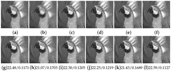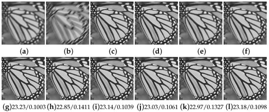 In addition, we also compared our methods with those of the past two years. The experimental results are displayed in Figure 18 and Figure 19. From Figure 18c and Figure 19c and the corresponding enlarged images, it can be clearly seen that the TVp,q(x) method produces results with significant loss of texture details. The visual quality of the deblurring results obtained using D-TGV methods is too smooth and accompanied by obvious artifacts. The specific results can be seen in Figure 18d and Figure 19d. In contrast, the proposed method achieves higher visual quality, including preserving details, preventing oversmoothing, and avoiding artifacts.