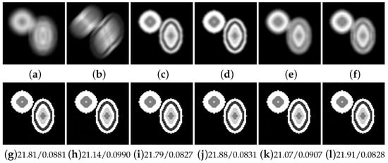 The first row shows blurred Twocircle images with different kernels from left to right: (a) Scenario I, (b) Scenario II, (c) Scenario III, (d) Scenario IV, (e) Scenario V, (f) Scenario VI. The noise carried by these blurry images is Gaussian noise with a mean of zero and a standard deviation of 10−3. The six images in the second row are the recovered results of the proposed method. The SNR and RMSE values of the restored image are displayed in the image annotation.