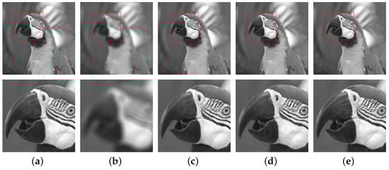The five Parrot images in the first row from left to right are: (a) Original image, (b) blurred image (Scenario V), (c) deblurred image by TVp,q(x) [], (d) D-TGV [], (e) our method. The second row image is an enlarged image corresponding to the first row image.