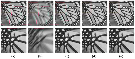 The five Butterfly images in the first row from left to right are: (a) Original image, (b) blurred image (Scenario II), (c) deblurred image by TVp,q(x) [], (d) D-TGV [], (e) our method. The second row image is an enlarged image corresponding to the first row image.
