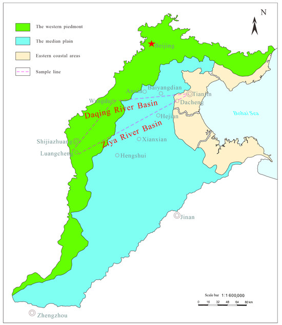 From west to east, the horizontal distances from the Shijiazhuang profile to the Luancheng, Wangdu, Hengshui, Anxin, Xian County, Baiyangdian, Hejian, Dacheng, and Tianjin profiles were 15, 60, 94, 133, 145, 165, 178, 202, and 258 km, respectively, forming a piedmont–central plain–coastal area sampling line across the North China Plain.