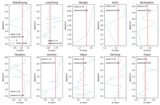 Based on Equation (1), the fractal dimensions (D values) of the soil structure were calculated for 207 samples from ten profiles spanning the piedmont, central plain, and coastal areas. After obtaining the D values for each profile at different depths, the mean and variance of the D values for each profile were calculated (Figure 2). The results show that the profile with the lowest mean D value was the Shijiazhuang profile in the piedmont area (1.08). The same profile also had the largest variance in D values, indicating a greater difference in soil particle sizes and greater variation in D values with depth compared to the central plain and coastal areas. In contrast, another piedmont profile, Luancheng, has a relatively large mean D value of 1.57 and a small variance of 0.019. This was attributed to the significant impact of long-term agricultural activities on the soil in the Luancheng profile. Both the Baiyangdian and Tianjin profiles show large mean D values that exceed 1.5 with small variances. This indicates that soil particle size differences decrease and tend towards finer particles as they move closer to coastal areas, with smaller variations in D values with depth. The Wangdu profile exhibited a large mean D value but a small variance, which can be attributed to the limited number of samples in this profile.
