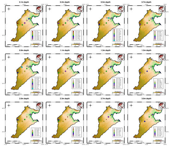 Spatial variation of soil D values at different depths. The color and radius of the circles together represent variation trends in D values at the same depth. Color indicates grade and radius indicates size.