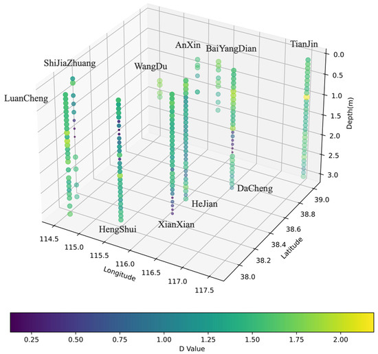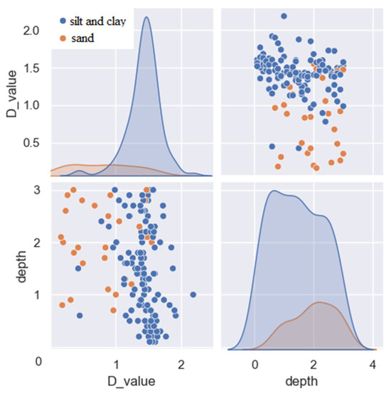 Differences in soil particle composition also determine the spatial variation in soil D values within the soil [18]. Following the selection of profiles in Section 3.3.2, the relationship between the soil D value and soil particle composition was analyzed for the Hengshui, Xianxian, Hejian, Dacheng, and Tianjin profiles. The particle compositions of 150 samples from different depths in the five profiles were analyzed according to the USDA textural classification (soil texture classification by the U.S. Department of Agriculture). The soil samples were named based on the percentage content of sand, silt, and clay, and classified into two categories: sandy soil (yellow dots) and silty clay (blue dots). These were then correlated with soil D values and depths, resulting in a scatter plot matrix of soil D values and depths for different soil types (Figure 11). The figure shows that sandy soils are found below a depth of 0.8 m, whereas silty clays are almost uniformly distributed at depths of 0 to 3 m. Soil D values for sandy soils are mainly concentrated between 0 and 1, whereas soil D values for silty clays follow a normal distribution, with most D values ranging between 1 and 2, peaking at approximately 1.5.