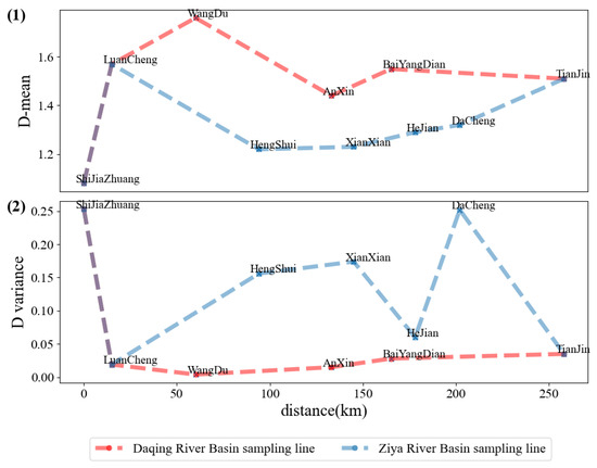 Based on the “triangle” sampling line from Figure 1, the horizontal distances in the two river basins was determined, and the spatial variation of the mean D values and variance of mean D values were plotted, as shown in Figure 5(1),(2). In Figure 1, the horizontal distances from the Shijiazhuang profile to the other profiles in the Daqing River Basin from west to east are Luancheng (15 km), Wangdu (60 km), Anxin (133 km), Baiyangdian (165 km), and Tianjin (258 km), corresponding to the Daqing River Basin sampling line (red dashed line in Figure 5). Similarly, the horizontal distances from the Shijiazhuang profile to the other profiles in the Ziya River Basin from west to east are Luancheng (15 km), Hengshui (94 km), Xianxian (145 km), Hejian (178 km), Dacheng (202 km), and Binhai New Area (258 km), which correspond to the Ziya River basin sampling line (blue dashed line in Figure 5).