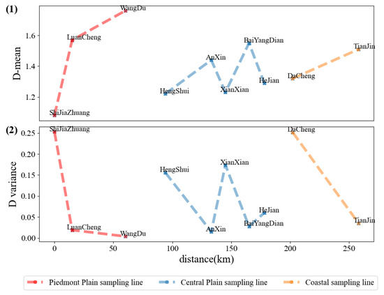 Spatial variation of mean soil D values (D-mean) and variance (D-variance) in piedmont–central plain–coastal area profiles. Note: (1) trend of D-mean with distance; (2) trend of D-variance with distance.