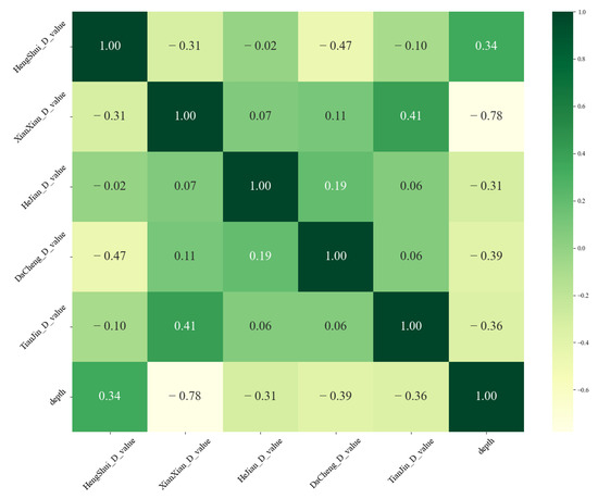 Heat map of correlation analysis between D values and buried depth among basin profiles.