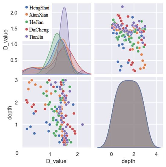 Profiles with the strongest spatial autocorrelation, that is, those with the highest global Moran’s I index, including Xianxian, Hengshui, Hejian, and Dacheng, and the profile with the weakest spatial autocorrelation, Tianjin, were subjected to an inter-profile correlation analysis. Depth was used as a factor in the correlation analysis to generate a correlation heatmap between D values and depth across the profiles (Figure 8). The data show that among the five profiles, the spatial correlation of D values is strongest between Hengshui and Dacheng (−0.47), whereas the spatial correlation of D values between other profiles is relatively low. The spatial correlation between Hengshui and Tianjin is only −0.095, indicating a strong spatial heterogeneity among these five profiles. Only the Xianxian profile exhibits a strong correlation between D values and depth (−0.78), indicating a strong spatial autocorrelation. As shown in the scatter plot matrix of the D values and depths for these five profiles (Figure 9), the D values for Hengshui and Dacheng did not follow a normal distribution (p < 0.05), whereas the D values for Xianxian, Hejian, and Tianjin did (p > 0.05). The distribution of the D values was relatively dispersed in the Dacheng and Hengshui profiles, whereas it was more concentrated in the Tianjin profile. The results for the Xianxian and Tianjin profiles strongly supported the conclusions of the global Moran’s I index analysis in Section 3.3.1.