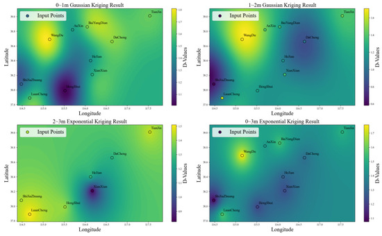 Similarly, for the ten profiles within the two basins at depths of 0–1, 1–2, 2–3, and 0–3 m, the spatial distribution, variation, and correlation characteristics of soil D values were analyzed and described using anisotropic semivariograms in geostatistics. GS+ 9.0 was used for modeling, including linear, spherical, exponential, and Gaussian models. The criteria for selecting the fitting model were the highest R2 and lowest RSS values. After comparing the four models, we found that the Gaussian model was suitable for the 0–1 and 1–2 m soil layers, whereas the exponential model was suitable for the 2–3 and 0–3 m soil layers (Table 3). Kriging interpolation, spatial modeling, and random field interpolation were performed to visualize the spatial variation (Figure 10). Although the sample size was relatively small (37 samples), resulting in smaller R2 values for each layer, all layers except the 2–3 m layer met the model analysis requirements, with the minimum range (21.5 km) being smaller than the sampling interval.