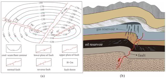 Schematic diagram of fault with tortuosity: (a) Plan diagram of the tortuous fault, the upper and lower plates of the faults are indicated by red lines; (b) Profile diagram of fault effect on oil and gas transportation, and the red tortuous line represents fault.