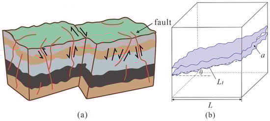 Diagram of faults with tortuosity: (a) Diagram of tortuous faults in three-dimensional space, and the red tortuous lines represent faults; (b) Geometric model diagram of a fault unit with tortuosity; where τ is the tortuosity of fault; the Lt is the actual length of the flow channel in fault; a is the geological fault opening; and θ is the dip of the fault plane relative to the direction of fluid flow.