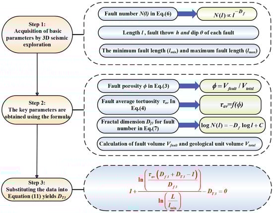 For the calculation of DT3 for each geological unit, we divided it into the following three steps: (a) Basic data were measured by a 3D seismic exploration. Basic data include the length (l) and dip (θ) of each fault, the number of faults with a length longer than or equal to l, and the minimum length (lmin) and maximum length (lmax) of each fault, which were derived by comparison; (b) The key parameters are calculated from the derived model. Key parameters include fault volume (Vfault), geological unit volume (Vtotal), fault porosity (ϕ), average fault tortuosity (τav), and fractal dimension of the number of faults (Df3). We drew Figure 3 for easy understanding of the calculation process of DT3.