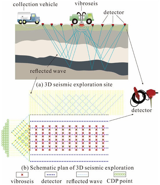 Schematics of 3D seismic exploration site and plan: (a) 3D seismic exploration site, use of seismic wave propagation properties in subsurface media to infer subsurface structures; (b) Schematic plan view of the 3D seismic exploration.