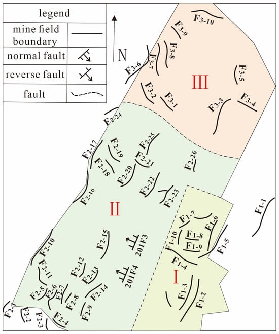 As shown in Figure 4, we divided three mining area ranges as the study objects, which are recorded as geological units Ⅰ, Ⅱ, and Ⅲ, respectively. The whole mining field range is recorded as geological unit Ⅳ. Using the length l, drop H, and dip θ of each fault measured by geological exploration, the horizontal break is obtained by using the relationship between dip and drop. The steps for deriving the volume of the faults are as follows: (a) The horizontal break of the fault is obtained by using the relationship between drop and dip; (b) the volume of the faults is obtained by multiplying the drop, the horizontal break, and the length of the interval; (c) the measured volume of the faults within each geological unit is added up, and the total volume of the faults within geological units I, II, III, and IV is 779,193.9221, 281,160.8316, 42,179.90738, and 1,102,534.66108 m3, respectively. Then we can obtain that the volumes of the units in which the faults are located are 14,430,150, 10,612,800, 2,324,118, and 27,367,068 m3 by using the maximum difference between the area of the geological unit and the elevation of the fault. Finally, the values of fault porosity ϕ can be calculated by Equation (8).