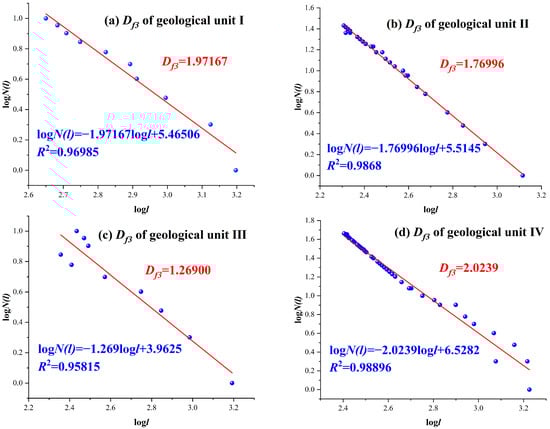 According to Equation (7), Df3 of each geological unit can be fitted. As shown in Figure 6, the Df3 of geologic unit Ⅰ, geologic unit Ⅱ, geologic unit Ⅲ, and geologic unit Ⅳ are 1.97167, 1.76996, 1.26900, and 2.02397, respectively. This indicates that geological unit IV has the most complex distribution of faults, while geological unit III has the simplest distribution of faults, from the perspective of the number of faults developed.