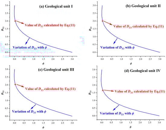 Previous studies have demonstrated the classical correlation between fractal dimension for fracture tortuosity and fracture porosity [39]. Inspired by them, we plotted the variation curves of the fractal dimension for fault tortuosity (DT3) versus the fault porosity (ϕ). As shown in Figure 8, DT3 decreases with ϕ increasing, and the values of DT3 marked with red dots coincide with the classical correlation between fractal dimension for fracture tortuosity and fracture porosity from the previous studies. Therefore, the above analysis supports the evidence on the validity of the proposed estimating method on DT3.